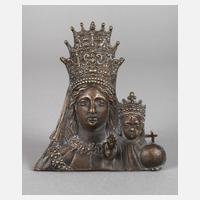 um 1900, ungemarkt, Bronze braun patiniert, halbplastische Darstellung der Muttergottes als Himmelskönigin, den ebenfalls bekrönten Christusknaben zu ihrer Linken, mit Reichsapfel und im Segensgestus erhobener Hand, rs. Montierungsreste, Maße 13 x 11 cm.