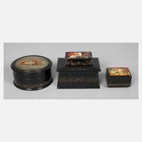 20. Jh., teils gemarkt, dabei Fedoskino Runddose 1992, verziert von winterlicher Schlittenfahrt, sowie zwei truhenartige Modelle, welche Szenen aus Märchen und Fabeln illustrieren, die größere gemarkt Palekh, gute Erhaltung, L max. 10 cm.