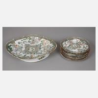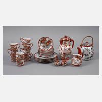 um 1920, gemarkt, zartes Porzellan mit weißem Fond, in polychromer Aufglasurbemalung und Goldstaffage, verziert von Landschafts-, Floral- und Tiermotiven, bestehend aus Kaffeekanne, Teekanne, neun Tassen, acht Untertassen, vier Desserttellern, einem Sahnegießer sowie zwei Miniaturväschen, Alters- und Gebrauchsspuren, H max. 20 cm.