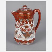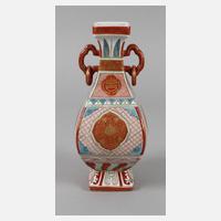 Mitte 20. Jh., am Boden gepinselte Sechs-Zeichen-Marke, Porzellan in polychromer Aufglasurbemalung mit Goldstaffage, abgekanteter, gebauchter Korpus mit schlankem Hals und ausgestellter Mündung, zwei seitliche Handhaben, umlaufender Ornamentdekor, H 25 cm.