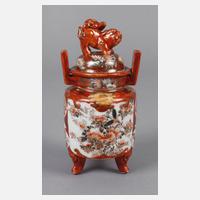 um 1930, am Boden mit gepinselter Marke, polychrome Aufglasurbemalung über hellem Fond, Goldstaffage, zylindrischer Korpus über drei kurzen geschwungenen Füßen, aufgelegter Kuppeldeckel mit plastischem Knauf in Form eines Fohhundes, umlaufend verziert von floralen Motiven sowie Tierdarstellungen und Ornamentik, etwas berieben, H 17 cm.