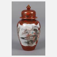 Anfang 20. Jh., am Boden gepinselte Marke, Weißporzellan in polychromer Aufglasurbemalung, zarte Goldstaffage, konisch zulaufender Korpus mit Profilierung, flacher aufgelegter Deckel mit Blütenknauf, die Wandung verziert von Landschafts- und Tiermotiven sowie ornamentalen Elementen, berieben, brandfleckig, H 21 cm.
