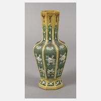 um 1900, ungemarkt, Porzellan polychrom glasiert, facettierter Korpus mit reliefierten Blütenmotiven, leicht konisch zulaufender Hals, min. Craquelure, H 22 cm.