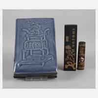 Anfang 20. Jh., am Boden mit geprägter Marke, Porzellan in blaugrauer Unterglasurbemalung, langrechteckiger Korpus mit leicht gewölbtem Deckel, dieser reliefiert mit Vasenmotiv, innen zwei Aussparungen für Tuschsteine, brandfleckig, Altersspuren, beigegeben zwei Tuschsteine, teils vergoldet und verziert, Maße 2,5 x 13 x 8 cm.