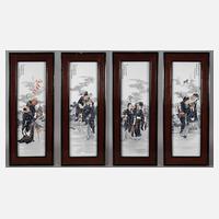 1. Hälfte 20. Jh., signiert und bezeichnet, Porzellan in polychromer Aufglasurbemalung, vier hochrechteckige Platten, jeweils mit Darstellung zweier, der insgesamt acht Unsterblichen, als Ganzfiguren mit ihren typischen Attributen, als Pendants gearbeitet, in breiten Massivholzrahmen gefasst, leichte Altersspuren, Maße je 89 x 33 cm.