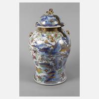 18. Jh., ungemarkt, Porzellan in kobaltblauer Unterglasurbemalung sowie reicher Staffage in polychromen Emailfarben und Vergoldung, Balusterkorpus, umlaufend verziert von kleinen angedeuteten Handhaben in Form stilisierter Drachenköpfe, die Wandung zeigt ein Landschaftspanorama, durchsetzt von Glückssymbolik, Früchten und Blüten, der Kuppeldeckel in korrespondierendem Dekor, dessen Knauf plastisch in Form eines Fohhundes gearbeitet, zusätzliche Messingmontierungen, Scharnier defekt, alt repariert, berieben, H 49 cm.