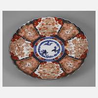 19. Jh., ungemarkt, Porzellan in kobaltblauer Unterglasurbemalung, verziert von Goldstaffage und korallfarbener Aufglasurmalerei, die profilierte Fahne fächerartig verziert von Landschaftsdarstellungen und Drachenmotiven, retuschierter Ausbruch, Altersspuren, D 46 cm.