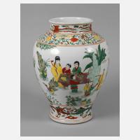 19. Jh., ungemarkt, signiert, weiß glasiertes Porzellan in polychromer Emailbemalung, gebauchter Korpus mit kurzem zylindrischen Hals, die Wandung umlaufend verziert von genrehaften Darstellungen in Gartenlandschaft, gerahmt von Drachenmotiven, Blütenranken und Glückssymbolik, etwas brandfleckig, H 37 cm.