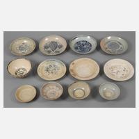 überwiegend Annam (Vietnam), 16./17. Jh., zwölf Teile, fünf Schalen und sieben unterschiedlich gemuldete Teller, meist in Blautönen bemalt, verziert von Ornamentik und stilisiertem Floraldekor, unterschiedliche Maße und Erhaltungen, D max. 21 cm