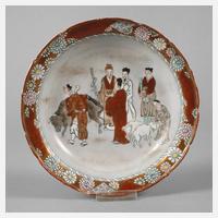 Anfang 20. Jh., am Boden gepinselte Drei-Zeichen-Marke, Porzellan in farbiger Emailbemalung und zarter Goldstaffage, die Fahne verziert von figürlichen Darstellungen, gerahmt von Ornamentbändern und Blütenmotiven, Altersspuren, kleine Chips, D 18 cm.