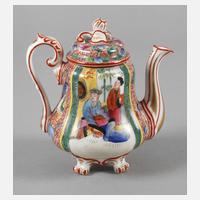 um 1920, am Boden mit Pinselmarke, Weißporzellan in polychromer Aufglasurbemalung und zarter Goldstaffage, auf vier Löwentatzenfüßen ruhender Korpus mit profilierter Wandung, diese verziert von Chinoiserien, der Kuppeldeckel mit Blütenknauf, berieben, H 16 cm.