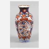 19. Jh., ungemarkt, Porzellan in kobaltblauer Unter- und korallfarbener Aufglasurbemalung sowie reicher Goldstaffage, konisch zulaufender, gebauchter Korpus mit kurzem Hals und leicht ausschweifender Mündung, umlaufend vier geschwungene Kartuschen, gefüllt mit Floralmotiven, Paradiesvögeln und Glückssymbolik, gerahmt von Ornamentbändern und Rankwerk, Mündung restauriert, brandfleckig und rissig, etwas berieben, H 25 cm.