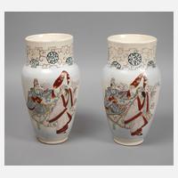 Japan, Mitte 20. Jh., ungemarkt, Porzellan in cremefarbener Craqueléglasur, fein verziert in Emailfarben, teils reich goldstaffiert, schlanke Korpora mit figürlichen Darstellungen aus dem Theaterleben, gerahmt von Ornamentband, Altersspuren, etwas berieben, H je 32 cm.