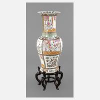 20. Jh., am Boden mit Vier-Zeichen-Marke, Porzellan in polychromer Aufglasurbemalung und reicher Goldstaffage, hoher gebauchter Korpus mit zylindrischem Hals, welcher in die ausschwingende Mündung ausläuft, die Wandung umlaufend mit vielfigurigen Szenen in Einzelkartuschen verziert, gerahmt von Ornamentdekor, floralen Elementen und Glückssymbolik, auf durchbrochen gearbeitetem, dunkel gebeiztem Hartholzsockel, H ges. 121 cm.