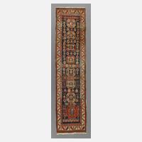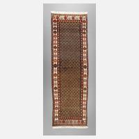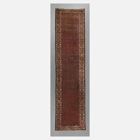 1. Hälfte 20. Jh., dicht durchmustertes Innenfeld mit breiten umlaufenden Bordüren, leichte Altersspuren, Maße 277 x 99 cm.