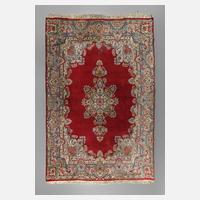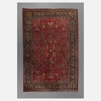 1. Hälfte 20. Jh., dunkelroter Fond mit lockerem Flordekor, mehrteilige umlaufende Ornamentbänder, Alters- und Gebrauchsspuren, Mottenschäden, Maße 358 x 264 cm.