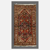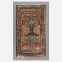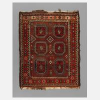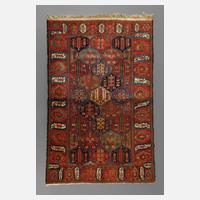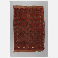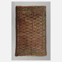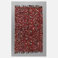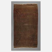 1. Hälfte 20. Jh., reduzierter geometrischer Dekor über rostrotem Fond, mehrteiliger Bordürenbereich, Altersspuren, reinigungsbedürftig, Fransenbesatz gekürzt, Maße 202 x 119 cm.