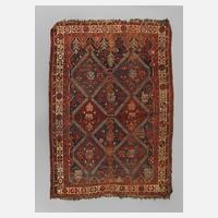 um 1900, rautenförmig gegliedertes Zentrum mit umlaufenden Ornamentbändern, starke Altersspuren, Maße 190 x 152 cm.