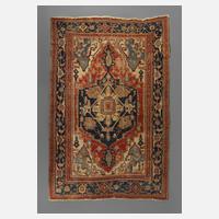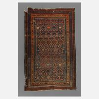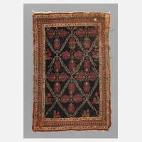um 1900, gitterartig unterteiltes Mittelfeld mit stilisiertem Blütendekor über kräftig blauem Grund, mehrteiliger Bordürenbereich, starke Erhaltungsmängel, Maße 161 x 125 cm.
