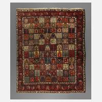 1. Hälfte 20. Jh., als Gartenteppich schachbrettartig gegliedertes Mittelfeld, breite umlaufende Bordüre, Fransenbesatz gekürzt, Altersspuren, Maße 380 x 336 cm.