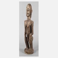Mali, um 1900, der Volksgruppe der Dogon zugeordnet, in der Art des Meisters von Ogol, vollplastische Darstellung einer hockenden Frau mit typischer Haartracht, Tatauierungen an Körper und Kopf, H 68 cm.