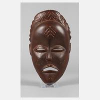 Elfenbeinküste, leichtes dunkles Tropenholz mit Stammestatauierungen, rückseitig mit Löchern zur Befestigung, kleinere Substanzverluste, schönes, getragenes Stück aus einer Altsammlung, H 20 cm.