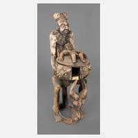 Kongo, der Volksgruppe der Hemba zugeordnet, dunkles Tropenholz, vollplastische Darstellung eines knienden Mannes, welcher einen Weiteren auf der Schulter trägt, beide mit schmalem Bart und Haarband, trocknungsrissig, sonst altersgemäß gute Erhaltung, H ca. 47 cm. Provenienz: aus der Sammlung von Dr. W. Nerlich, München.
