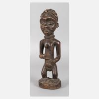 Kongo, der Volksgruppe der Luba oder Hemba zugeordnet, Tropenholz beschnitzt, vollplastische naive Darstellung einer Frau mit kurzer zopfartiger Haartracht, Substanzverluste, H 31 cm. Provenienz: aus der Sammlung von Dr. W. Nerlich, München.