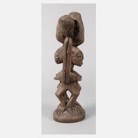 Elfenbeinküste, der Volksgruppe der Senufo zugeordnet, braun gefasstes Tropenholz, die nach unten gehenden Zapfen sollen wohl die Bindung zur Erde darstellen, auf Plinthe aus Plexiglas montiert, berieben, sonst altersgemäß gute Erhaltung, H 29 cm.