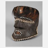 wohl Kongo, leichtes, schwarzbraun eingefärbtes Tropenholz, eingefasst von Rattanstreifen und rotem Lederband, Gesichtsschirm aus grobem Gewebe, verziert von Kaurischnecken und Metallblättchen, H ca. 30 cm.