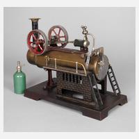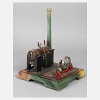 um 1935, gemarkt, Blech und Guss farbig lackiert bzw. blanke Teile vernickelt, Rechaud und Schlot mit Backsteinprägung, Messingkessel mit Dampfpfeife, Absperrhahn und Wasserstandsglas (ohne Glas), feststehender Zylinder mit Öler, ein Schwungrad sowie Brenner, auf Blechfundament montiert, Funktion nicht geprüft, bespielter Zustand, Schwungrad altersbedingt stärker rissig, Maße Fundament 27,5 x 27,5 cm, L Kessel 14,5 cm, D Kessel 5 cm.