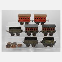 um 1920, gemarkt, Blech farbig lithografiert, Spur 0, zweiachsig, bestehend aus Tender, zwei Güter- und vier Personenwagen, dazu ein und vier Räder, minimale Alters- und Gebrauchsspuren, L Tender 7,5 cm, L Wagen je 8,5 cm.