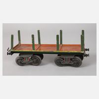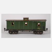 Modell 2998/1, Baujahr 1922–1926, gemarkt und bezeichnet, grün handlackiert, Spur 1, vierachsig, mit zwei Schiebetüren, abnehmbarem Dach sowie mittigem und einseitig offenem Oberlicht, beladen mit ca. 25 Leinensäcken und Holzstapeln sowie acht Figuren aus Masse und Holz, bespielter Zustand mit partiellen Farbabplatzern und Alterscraquelé, zwei Puffer fehlen bzw. einer lose, L ohne Puffer 29,5 cm.