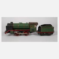 Modell R 921, Baujahr 1931–1934, gemarkt und bezeichnet, Blech handlackiert, grasgrün/schwarz, Spur 1, Achsfolge B, mit intaktem Uhrwerk, vor- und rückwärtsfahrend, Bremse, Hand- und Automatikschaltung, Zylinder mit Kreuzkopfsteuerung, Schiebesteuerung, zwei imitierte Stirnlampen, kleine geteilte Windleitbleche, helle Puffer und zweiachsiger Kohletender R 929, dazu passender Schlüssel und lädierter Originalkarton mit Firmenetikett, bespielter Zustand mit schöner Alterspatina, minimalen Farbabplatzern und leichter Delle am Dach, L gesamt 45 cm.