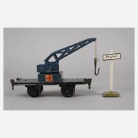 Modell 1974/1, Baujahr 1929-1937 und Modell 2342, Baujahr 1924-1933, gemarkt bzw. bezeichnet Germany, Blech handlackiert, Spur 1, der blaue zweiachsige Kranwagen mit drehbarem Ausleger, Handkurbel und schwarzen Puffern, Haken ergänzt, schwarze Aufschrift 10.00 K mit Papier überklebt, dazu Hinweistafel mit schrägem Schild und Aufschrift "Pfeifen", beide Teile bespielt und mit minimalen Farbabplatzern, L Wagen 19,5 cm, H Schild 12 cm.
