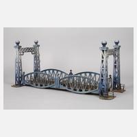 Modell 2504/1, Baujahr 1909-1918, ungemarkt, Blech geprägt und handlackiert, blau, Spur 1, Eisenbahnbrücke in imitierter Eisenkonstruktion mit Doppelbogenbrücke, Uhrwerkschienenstück und beidseitigem Durchfahrtstor mit je zwei imitierten Isolatoren, bespielter Zustand mit minimalsten Farbabplatzern, beide Gittermastdurchfahrten an der Fundamentplatte beschnitten (ursprünglich Teil der Auffahrten), ohne Fahnenbesatz und einem losen Geländer, etwas reinigungsbedürftig, L Bogenbrücke 51,5 cm, H Masten 28,5 cm.