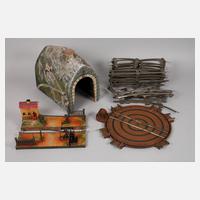 alles um 1915, meist ungemarkt, Blech bzw. Holz handlackiert, Spur 1, bestehend aus Bahnübergang 2174 mit Wärterhaus in Ziegelsteinoptik, Angeltür, roten Glasscheiben für Beleuchtung, Läutwerk, Bahnschranke mit Zugauslösung, zwei Zäunen, Bank sowie einigen Fehlteilen, L 35 cm, dazu Tunnel 2536/1, Holzgestell mit Papierbezug, Spritzmasse, Haus- und Turmbesatz, untere Einfahrtbreite vergrößert, H Einfahrt 21 cm, L 38 cm, sowie Drehscheibe FE 2131/1, mit Handkurbel, Scharnierverriegelung und sechs Schieneneinsätzen, L Drehschiene 33,5 cm, D gesamt 42 cm, beigegeben ca. 25 gerade und gebogene Uhrwerkschienen sowie fünf Weichen, unterschiedliche Alters- und Gebrauchsspuren, Schienen teils reparaturbedürftig.