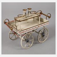 um 1920, blasse Stempelmarke mit undeutlichem Firmenlogo und Angabe Made in Germany, Blech handlackiert, beige, zweiachsig und doppelstöckig, mit Flaschenhalterung, ohne Bestückung, bespielter und leicht verbogener Zustand mit kleinen Lackabplatzern und losem Gestell, L 19 cm, H 14 cm.