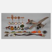 um 1930, teils gemarkt, passend zu Spur 1 und 2, bestehend aus fünfteiliger Bing Signal-Garnitur, darunter Warn- und Hinweistafeln, teilmontiertem Dux Baukasten-Flugzeug und Zigarrenkiste mit ca. 30 Kleinteilen aus Blech, Zinn, Holz, Masse und Celluloid, teils stärkere Alters- und Gebrauchsspuren, H Signal max. 18 cm, L Flugzeug 35 cm.