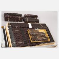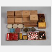 um 1930, ungemarkt, bestehend aus ca. 20 Kartons mit Streupulver, bezeichnet als Eisenbahnschwarz, Wiesengrün, Wiesenbunt, Nadelbaumgrün, Ackerbraun, Korngelb, Schneeweiß etc., darunter drei Kartons mit Trockenmaterial wie Miniaturzapfen und Blüten, dazu Kreide, zwei Portionierer und drei Siebe, beigegeben drei Sandkastenformen aus Blech, altersgemäßer Zustand, Maße Karton max. 12 x 11 x 8 cm.
