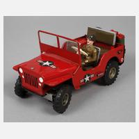 datiert 1953, gemarkt, mit Zusatz Made in Western Germany und Patentangabe, auf Nummernschild bezeichnet J-2500 U.S. Army 1953, Blech und Kunststoff, seltene Ausführung in Rot, offener Jeep mit intaktem Uhrwerkantrieb, Start-Stopp-Hebel, richtiger Lenkung, klappbarer Windschutzscheibe, Gummibereifung, einem Massesoldat (von 2) als Besatzung, Reserverad und Benzinkanister, bespielter Zustand mit partiellem Farbabrieb, vordere Stoßstange und klappbare Kelle fehlen, L 16 cm.