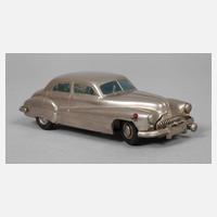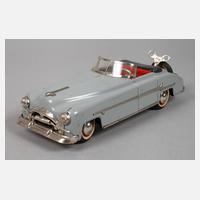 um 1955, ungemarkt, bezeichnet Made in U.S.-Zone Germany, Uhrwerkantrieb intakt, graue Blechausführung mit Chrombeschlägen, fünf Gängen, Handbremse, richtiger Lenkung, aufwendigem Kühlergrill und Zierleisten, eingefasster Windschutzscheibe, lithografiertem Cockpit, Verdeckschutz, Reserverad, Gummibereifung und Schlüssel, altersgemäßer bespielter Zustand mit minimalem Lackabrieb, L 26 cm.