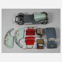 Kölner Automodelle, um 1950, gemarkt mit Zusatz Made in Germany Brit. Zone, pat. amtl. gesch. und bezeichnet, verchromter Metallguss, Fenster türkisfarben lüstriert, Uhrwerksantrieb, mit verschiedenen Funktionen und Gummireifen, ohne Schlüssel, Funktion nicht geprüft, bespielter Zustand mit partiellem Farbabrieb, L 14 cm.