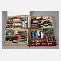 2. Hälfte 20. Jh., teils gemarkt Siku, Wiking, Matchbox etc., Metall und Kunststoff, bestehend aus ca. 100 Stück, darunter Feuerwehr-Löschfahrzeuge, Busse, Gespanne, LKWs, PKWs etc., bespielter Zustand, wenige Teile lose, L Ikarus-Schwenkbus 18,5 cm.