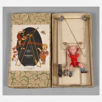 "Boku No Tomodachi (Mein Freund)", Hersteller Kuramochi, Japan, um 1930, gemarkt, farbig gefasste Celluloid-Gliederpuppe als sich überschlagender Geräteturner an klappbarem Metallgestell mit Uhrwerkantrieb, in originalem Karton mit Titelbild, innen datierte Widmung in Blei von 1930, Mechanik intakt, Püppchen am Hinterkopf gedellt und minimalst eingerissen, Karton minimal bestoßen, H Gestell 41,5 cm, Maße Karton 33,5 x 18 x 4 cm.