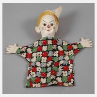 auch genannt "BiBaBo", Baujahr 1936-1943, gemarkt mit Knopf im Ohr, partiell bemalter Filzpresskopf mit Glasaugen, gelben Mohairhaaren, Filzhut, farbig bedrucktem Leinenkleid und Filzhänden, als drollige Handpuppe mit keckem Gesichtsausdruck in altersgemäß gutem und kaum bespieltem Zustand, lediglich Bommel und Schleife fehlen, selten, L 28 cm.