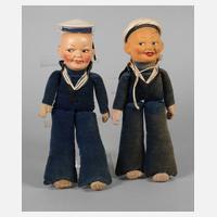beide um 1930/40, ungemarkt, bemalter Eingebindkopf aus Pappmaché bzw. Masse mit schelmischen Gesichtsausdruck und montiertem Hut, Samtkörper mit Schlenkergliedern, abgesteppten Fingern und Zehen sowie Stoffkragen, ein Hutband mit Schriftzug "Torpedoboot Möwe", unterschiedliche Alters- und Gebrauchsspuren, L je ca. 28 cm. Info: das Torpedoboot "Möwe" war ein Kriegsboot der deutschen Reichs- und späteren Kriegsmarine, Stapellauf 1926, 1944 versenkt, Quelle: Internet.