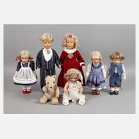 Junge und Mädchen Typ VIII: Das deutsche Kind, sowie weiteres Pärchen und "Mimerle" Typ 38 H, 2. Hälfte 20. Jh., alle an den Fußsohlen gemarkt, zwei mit originalem Etikett, jeweils drehbare Kunststoffköpfe mit typischer Gesichtsbemalung und handgeknüpfter Echthaarperücke, schlanke Stoffkörper mit Schaumstofffüllung, angewinkelten Schlenkerarmen, gescheibten Beinen sowie abgesteppten Fingern und Zehen, in originaler Kleidung mit Schuhen, unbespielte Vitrinenstücke, L dreimal 38 cm und zweimal 52 cm, dazu bespielte Heubach-Köppelsdorf Porzellankopfpuppe, gemarkt 342-0, mit offenem Mund, Schelmenaugen, loser Echthaarperücke, fünfteiligem Babykörper aus Masse und Stimme, L 38 cm, sowie einst geliebter Teddybär aus holzwollegestopftem Mohair, mit kleinem Buckel, beweglichen Gliedern, Glasaugen, gesticktem Maul und Krallendekor (3) sowie intakter Stimme, L 29 cm.
