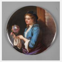 19. Jh., Prägebuchstabe G und Nummer 2, runde gewölbte Form mit feinster polychromer Aufglasurmalerei, Halbbildnis einer jungen Frau in Biedermeierkleidung vor Mauerbalken, einen Blumenstrauß haltend, Motiv minimalst berieben, sonst guter Zustand, D 7 cm.
