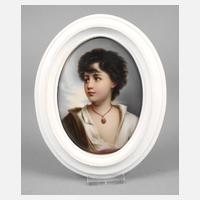 nach einem Gemälde von Gustav Karl Ludwig Richter (1823 Berlin bis 1884 ebenda), um 1900, Marke wohl überklebt, ovale, leicht gewölbte Porzellanplatte mit feiner polychromer Aufglasurmalerei, Brustportrait eines südländischen Knaben mit stürmischer Frisur, offenem Hemd, Ohrring und Medaillon um den Hals, neuzeitlich auf Papier montiert und gerahmt, guter Zustand, L Platte 13 cm.